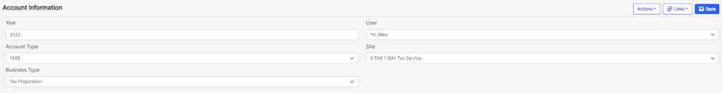- Year – Fillable field to designate the year associated with the Account file. Tax preparation files should match the Tax Year of filing.
