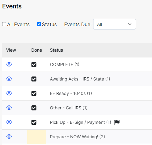 Office events will sort in chronological Start Date Order, with the Open Events (no End Date) defaulted as [Show Only Open Events] unless otherwise changed. *This view is more appropriate for linear workflows (only one status open at a time) like Tax Preparation.