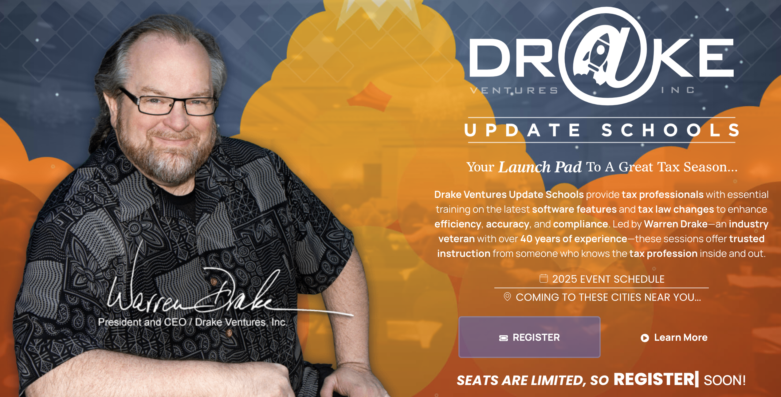 Join Warren Drake and the Drake Ventures team for a two-day, in-person training event designed to help tax professionals stay ahead of new regulations, software updates, and emerging technologies. Each session delivers valuable insights, hands-on instruction, and continuing professional education (CPE) credits.